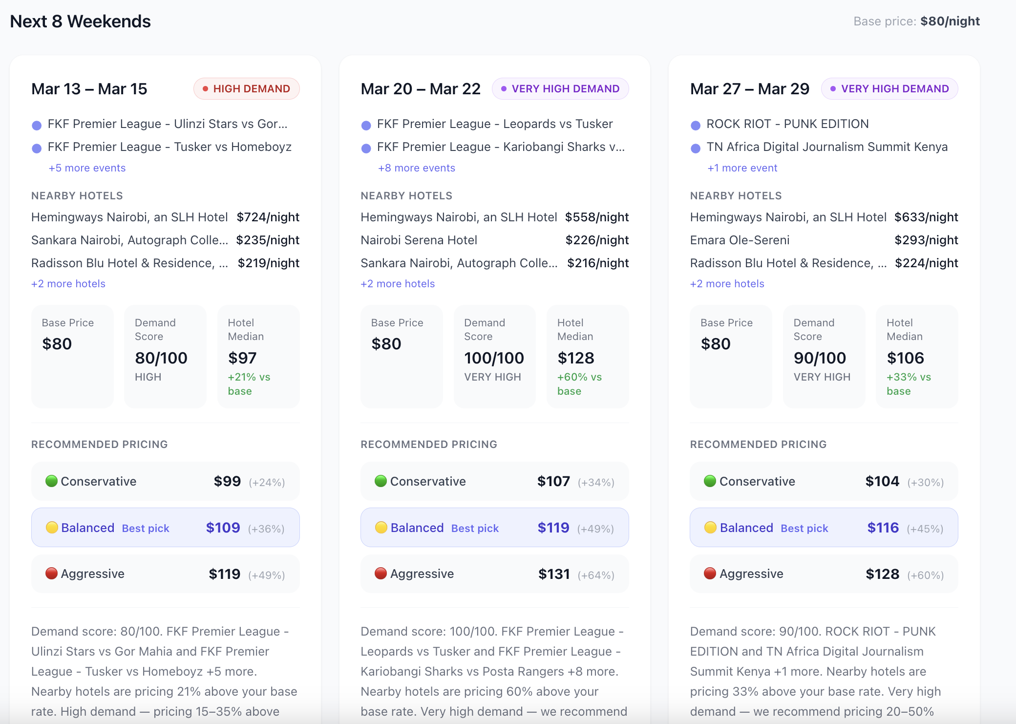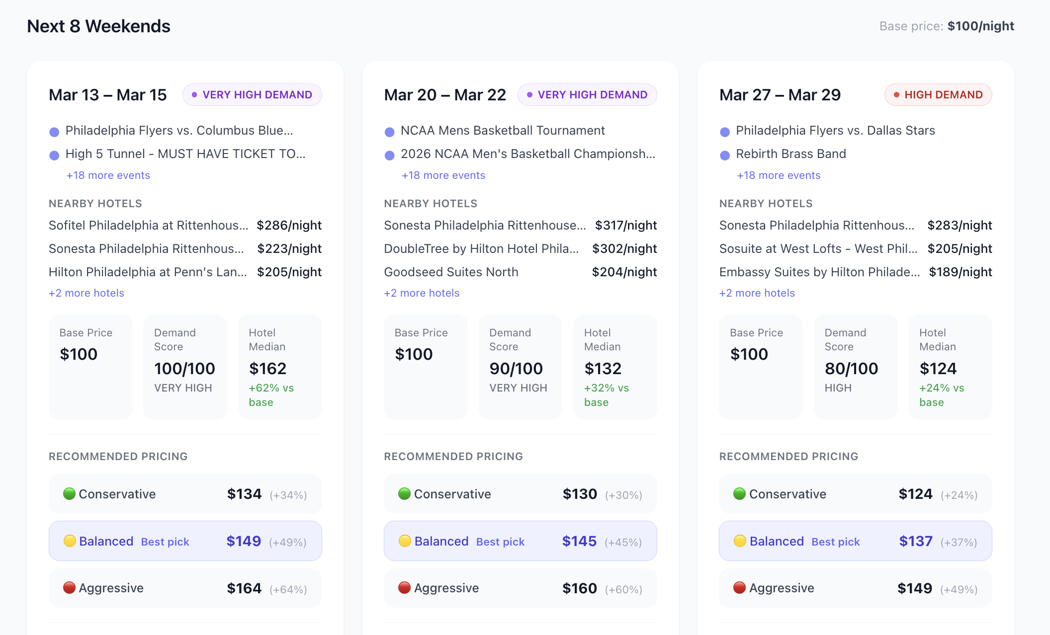 - 🏨 Nearby Hotel Pricing — We check what hotels in your area are actually charging that weekend. When hotels raise prices, it's a strong signal that demand is high.